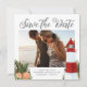 Casamento de destino costeiro com duas fotos, exceto o anúncio da data, inclui um farol e conchas com bonito escrita caligráfica. Nomes personalizados da noiva e do noivo, data do casamento e local dos detalhes do casamento incluídos.