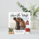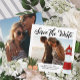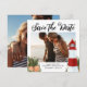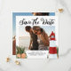 Casamento de destino costeiro com duas fotos salvando o anúncio de data inclui um farol e conchas com bonito escrita em preto sobre fundo branco. Nomes personalizados da noiva e do noivo, data do casamento e local dos detalhes do casamento incluídos.