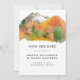 Foto de Casamento de Montanha no Outono com Aquarela Rústica - Salve o Dia - apresentando uma paisagem de montanha de outono deslumbrante com tipografia moderna. Uma foto de bleed total do Noivo e da Noiva é apresentada no verso do Salve o Dia. O anúncio faz parte de uma coleção.