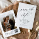Um casamento de fotos simples e chic salve o cartão de data com detalhes elegantes de caligrafia e texto clássico na frente. O verso tem uma foto e um código QR. Clique no botão editar para personalizar este design.