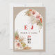Este maravilhoso casamento romântico entre feiticeiros salva a data, apresentando uma combinação de tendências de folhas de palma secas boêmicas e ilustração de cor d'água rosa em tons de cor do deserto, o ajudará a criar a suíte de casamento moderna ideal. Edite facilmente os campos de modelo para personalizar este cartão com a data do seu casamento, os nomes da noiva e do noivo na frente, e uma das suas fotografias de noivado favoritas no verso, tudo dentro de um arco moderno chic decorado com delicadas ilustrações florais.