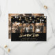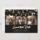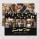 Cartões salve a data de fotos de casamento elegantes, preto e dourado, com um título de roteiro moderno. Nosso casamento salva a data mostra uma coleção de fotos de 3 imagens contra um fundo preto adornado com luzes de cordas na frente e uma foto na parte de trás. Personalize facilmente este cartão preto, salve o cartão de data com as suas imagens e detalhes do casamento.