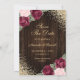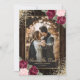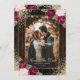 Elegante burgundy e blush floral foto de casamento salve o cartão de data com o hálito do bebê e a burgundy e rosas de pincel com verde em um fundo de madeira de celeiro com uma foto de ouro no meio. Personalize facilmente este modelo de cartão com a sua fotografia e os seus detalhes de casamento para criar uma fotografia de casamento floral única, salve o cartão de data para a sua festa de casamento cor-de-rosa e borrão.
