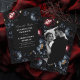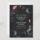 Coloque a palco de um evento assombrosamente elegante com este gótico Salvar as Datas. Este luxuoso casamento floral salva os cartões de data... com um buquê de peões negros e vermelhos e bagas azuis contra um fundo negro. O fundo é um lugar para a sua foto. É perfeito para uma celebração dramática e inesquecível. Eles são ideais para amantes do romance escuro e do atrativo do eterno.