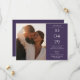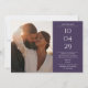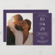 Um cartão moderno e minimalista com sua data especial, fotos e detalhes de casamento, em tipografia clássica e em fundo roxo. Projetado por Thisnotme©