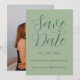 Cartão "Salvar a data" do casamento fotográfico moderno. Elegante Script com verde-na moda e verde-escuro Anuncie seu grande dia em estilo com este cartão minimalista, ainda romântico, "Salve a Data", com um fundo verde-sábio na moda emparelhado com um roteiro caligráfico elegante verde-escuro e tipografia moderna. Esta design combina o romance do eterno com a simplicidade moderna, criando uma sensação quente e sofisticada para os seus convidados de casamento. Personalize facilmente com sua própria foto, nomes e data de casamento usando as simples ferramentas de edição do Zazzle. A combinação de uma fonte na moda moderna e sua foto favorita de noivado faz deste cartão um anúncio digno de manutenção de que seus hóspedes vão tesourar. Perfeito para casais que procuram uma estética de casamento clássica, mas contemporânea, esta design versátil combina tudo, desde casamentos vinícolas até comemorações de inverno. Arte original e layout da artista e designer Catherine Sweetman, disponível exclusivamente no Zazzle, garante que sua "Salvar a Data" seja tão única quanto sua história de amor.
