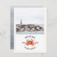 Um casamento náutico rústico salva a data com a ilustração de um caranguejo vermelho com foto personalizada na frente. A parte de trás é a cor aquosa de chambray, a design inspirada na cor aquática.