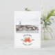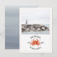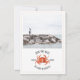 Um convite de casamento náutico rústico com ilustração de um caranguejo vermelho e foto personalizada na frente. O verso tem um design inspirado em aquarela na cor chambray.