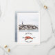 Um convite de casamento náutico rústico com ilustração de uma lagosta vermelha e foto personalizada na frente. A parte de trás tem um design inspirado em aquarela na cor chambray.