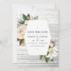 Convite de casamento floral com peônias brancas, ervas silvestres, algodão e lírios com moldura geométrica dourada personalizável para os detalhes do seu evento. Ideal para qualquer tema ou casamento de jardim.
