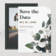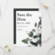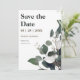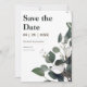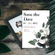 Este moderno Eucalipto Foto Salve os recursos do design de Anúncio de Data com folhas e botões de eucalipto, design de texto simples e posicionamento para sua foto no verso. Adicione sua foto favorita e a data do casamento para personalizar. Design perfeito para primavera e casamentos de verão.