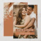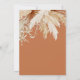 Cartões elegantes de save the date de casamento boho com foto do noivo e noiva, caixas monocromáticas em tons terrosos com um modelo de texto editável. No verso há um fundo terracota com folhas de palmeira secas em aquarela no deserto, e grama pampas da moda.