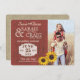 Salve a data rústico com madeira de celeiro vermelho com foto acentuada com girassóis e desenho de aniagem nas costas. Personalize o texto conforme preferir e adicione um endereço de site de casamento ou outras informações nas costas.