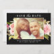 Cartão de casamento com data para salvar apresenta uma foto de noivado horizontal emoldurada por flores em aquarela com folhagem verde e tons pastéis de rosa, rosa claro e pêssego de dália e rosa de primavera e verão. Listras brancas horizontais adornam a parte de trás do cartão. O fundo preto e rosa pode ser personalizado para combinar com as cores do seu casamento.