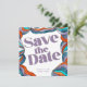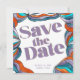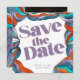 Você está procurando um casamento retro-moderno único e moderno e moderno, salve a data? Olhe para a nossa foto de onda roxa, retro-inspirada em um único molde, Boho preto, salve a data! Esta onda que salva a data apresenta lindas linhas onduladas pintadas à mão, trabalho de arte com um desenho abstrato colorido e boho dando uma aparência única e tendenciosa, excelente para um tema de casamento retrô. Você pode adicionar uma foto.