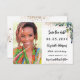 Adicionar uma foto de tamanho vertical. Uma foto moderna e elegante Salve a Data. Um fundo branco chico decorado com verde de eucalipto, folhagem de ouro e faíscas. Personalize e adicione sua foto e detalhes.