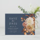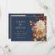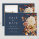 Este elegante leque de mão para programa de casamento apresenta folhas de laranja queimada e terracota pintadas à mão em aquarela, dahlias creme e bege, e belas rosas de cor enferrujada em um fundo azul marinho. A parte de trás inclui um buquê floral e de folhas correspondente com uma foto. Encontre itens correspondentes na Coleção de Romance de Outono Azul Marinho.