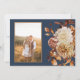 Este elegante fã de mão do programa de casamento apresenta cor d'água queimada manualmente laranja e folhas de terracotta, creme e dahlias beges, e belos rosas de cor ferrugem em fundo de marinho. O verso inclui um buquê floral e foliar correspondente com uma foto. Localize itens correspondentes na Coleção de Romance de outono Azul de Marinho.