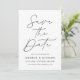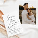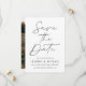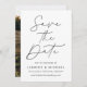 Anuncie seu próximo casamento em estilo com esta tenda foto do moderno Black Script, salve o cartão de data! O design apresenta "Save the Date" (Salvar a data) exibido na caligrafia em preto de tendências. Personalize o minimalista e salve a data com seus nomes, data do casamento, local e site do casamento. O convite reverte para exibir sua foto de noivado vertical com sangramento de cheio. O branco e preto chico salvam a data a escolha perfeita para casamentos modernos.