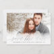 Esta elegante salvação da data apresenta um guião prateado em folha falsa, com um backer listrado. Carregue sua própria foto e personalize as informações para incluir os detalhes do seu casamento.