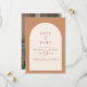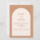 Envie seus anúncios de noivado em estilo com este moderno caramelo, neutro, em forma de arco terrorista Casar Salve a Data, com sua foto de noivado favorita no verso. Copyright Designs da Anastasia, todos os direitos reservados.