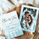 Anuncie o seu casamento com estes Cartões salve a data de Foto do Casamento no inverno de Floresta Neve. Apresentando um fundo romântico de pinheiros com neve em tons azuis suaves, o design inclui espaço para mostrar sua foto de noivado favorita. Perfeito para casamentos rústicos, florestais ou montanhosos.