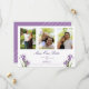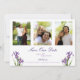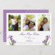 Antecipe um casamento elegante com este delicado floral, salve a data. Duas flores da íris florescem nos cantos inferiores do cartão, moldando texto roxo suave. Você pode personalizar três fotos verticais acima. A parte de trás apresenta uma cor de lavanda sólida com um motivo minimalista e moderno. Um design perfeito para um casamento de primavera.