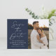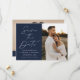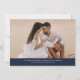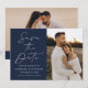 Anuncie seu próximo casamento em estilo com esta imagem do Marinho Modern Script moderno, salve o cartão de data! O design apresenta "Save the Date" (Salvar a data) exibido na caligrafia branca com fundo de marinho. Personalize a frente do minimalista, salve a data com seus nomes, data do casamento, local e foto vertical do noivado. A parte de trás do cartão exibe uma foto horizontal com o site do seu casamento mostrado abaixo. O marinho chic salva a data a escolha perfeita para casamentos modernos.