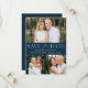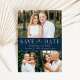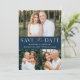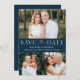 Anuncie sua data de casamento com esta na moda, foto moderna, salve o cartão de data. O design apresenta três das suas fotografias de noivado favoritas com "Save the Date" em fontes de serif e script brancas contra um fundo de marinho (ou cor da sua escolha). Personalize o minimalista e salve os anúncios de data adicionando seus nomes, data e local do casamento. A placa se reverte para um fundo de marinho sólido. A simples salvação do anúncio de data é perfeita para qualquer tema de casamento.