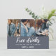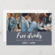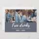 Casamento moderno salve os cartões de data em um roteiro com três design azuis que diz "Bebidas grátis e vamos nos casar". Personalize a parte frontal do cartão com suas fotos. Adicione seus nomes, data do casamento e local. Personalize a parte de trás do cartão com os detalhes do seu casamento. Entre em contato comigo através do botão abaixo se precisar de ajuda.