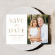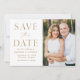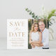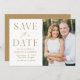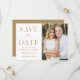 Anuncie sua data de casamento com esta na moda, foto moderna, salve o cartão de data. O design apresenta "Salvar a Data" em fontes de script e serif douradas com um fundo branco. Personalize o minimalista para salvar o anúncio de data, adicionando seus nomes, data, local do casamento e foto. A placa se reverte para um fundo ouro sólido ou cor de sua escolha. A simples salvação do anúncio de data é perfeita para qualquer tema de casamento.