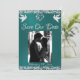 Esse design romântico apresenta um elegante fundo teal com bordas reluzentes, espaço reservado para fotos de casal, delicado coração prateado e pombos com data para o evento em roteiro elegante na frente. O verso tem um marcador de posição monograma, mais informações e lugar para o seu site no verso. Também disponível com diferentes planos coloridos para as cores do tema do casamento. (O brilho é simulado no trabalho de arte). Concebido para coordenar a Coleção de Casamentos "Dois Tornar-se-ão Um - Corações, Doves & Glitter". Para alterar os detalhes, clique em "Personalizar". Substitua a foto pela sua. Para mover o texto ou alterar o tamanho, a fonte ou a cor do texto, clique em "Clique para personalizar mais"