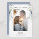 Anuncie sua data de casamento com esta elegante foto de casamento. Salve a data! Design com elegante verde-aquarela e floral armando sua foto. Volte com uma cor de fundo azul empoeirada e atraente, com as informações de data e cheio em branco. Verde e floral em uma bela mistura de tons brancos, azuis e verdes. Detalhes da caligrafia escrita à mão moderna, tanto na frente como no verso. Também disponível em marinho e em branco com floral. Parte de nossa coleção "Elegant Bliss" com uma variedade de convites coordenadores, inserções de cartões, cartões rsvp, acessórios de correio, salvamento de datas, cartas de agradecimento e placas de eventos e produtos.
