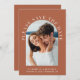 Casamento de terracotta moderno salve o cartão de data com sua foto em um quadro de arco e "Por favor, salve a data" em tipografia branca elegante. Sob sua foto, adicione seus nomes, data do casamento e local. No lado oposto, personalize a opção salvar os detalhes da data em uma simples tipografia branca e insira seu endereço de URL do site de casamento para criar um código de QR digitalizável para seus convidados visitarem facilmente seu site.