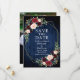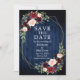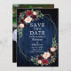 Elegante Watercolor Burgundy Floral Save O Cartão de Anúncio de Casamento de Data inclui rosas burgueses, flores azuis, rosas cor-de-rosa, flores vermelhas e verde numa moldura geométrica dourada. Madeira Azul Rústica Do País. Foto de volta.