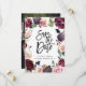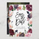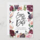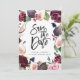 Cartão de aviso de casamento com foto floral rosa, borgonha e figo. Ilustração em aquarela e caligrafia moderna. Parte de uma coleção.