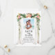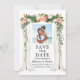 Anúncio de Noivado de Casamento Floral Tropical de Casamento Elegante Canopy Watercolor - Canopy Watercolor - Salve o Cartão de Data inclui lindas flores tropicais rosa, brancas e amarelas. O arco da copa do casamento da madeira inclui vegetação botânica. Foto do casal.