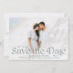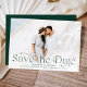 Anuncie seu casamento em estilo com estas cartões salve a data elegantes. O design apresenta a foto horizontal de sangria de cheio com "Save the Date" em caracteres verdes caçadores. Personalize a foto moderna salve o cartão de data com seus nomes, data do casamento, local do casamento e detalhes do convite. A parte de trás do cartão contém detalhes adicionais, como o site do seu casamento em letras brancas em um sólido fundo verde de caça.