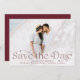 Anuncie seu casamento em estilo com estas cartões salve a data elegantes. O design apresenta a sua foto horizontal de cheio com "Save the Date" (Salvar a data) em letras arrojadas. Personalize a foto moderna salve o cartão de data com seus nomes, data do casamento, local do casamento e detalhes do convite. A parte de trás do cartão contém detalhes adicionais, como o site do seu casamento em letras brancas, sobre um fundo de burgundy sólido.