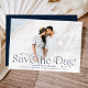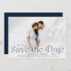 Anuncie seu casamento em estilo com estas cartões salve a data elegantes. O design apresenta a foto horizontal de sangria de cheio com "Save the Date" em caracteres de marinho. Personalize a foto moderna salve o cartão de data com seus nomes, data do casamento, local do casamento e detalhes do convite. A parte traseira do cartão contém detalhes adicionais, como o site do seu casamento em letras brancas, em um fundo de marinho sólido.