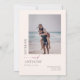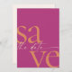 Esses cartões salve a data de 5" x 7" apresentam um design minimalista em letras laranja vibrantes e creme em um fundo magenta com espaços reservados atrás para os nomes de casais engajados, data de casamento e informações de local e sua foto favorita!