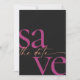 Esses cartões salve a data de 5" x 7" apresentam um design minimalista em melão vibrante e letras magenta em um fundo preto com espaços reservados atrás para os nomes de casais engajados, data de casamento e informações do local e sua foto favorita!