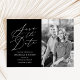Cartões salve a data de fotos elegantes com "Salvar a Data" exibidos em um script de caligrafia branca com fundo preto. Personalize o preto e branco e salve as datas com sua foto vertical do noivado, nomes, data do casamento e local. A parte de trás do cartão de data save moderno apresenta faixas pretas e brancas.