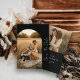 O design moderno e minimalista apresenta uma foto de quadro arquivada contra um fundo preto com um script de caligrafia manuscrito fino e uma tela de 2 fotos. Personalize facilmente suas informações importantes junto com suas fotos favoritas na frente e no verso. Ideal para qualquer tema moderno de casamento.