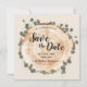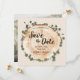 Com folhas verdes de eucalipto em torno de uma fatia rústica de anel de árvores de madeira, este casamento personalizável, exceto a data, certamente se destacará. Inicie o tema do seu casamento com um cartão de salvamento único que inclui a sua foto de noivado e o seu site de casamento (edite ou apague se não for necessário). Faça dela uma experiência memorável desde o início. O formato quadrado também é prático, moderno e na moda. Um cartão de manutenção.