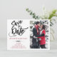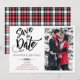 Estes anúncios Salvar a data são projetados com um design preto, vermelho e branco limpo com um padrão de xadrez de coordenação no verso. Personalize com sua própria foto e texto para anunciar seu dia especial. Faz um anúncio excelente para um evento elegante ou um casamento no inverno.