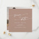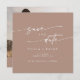 Esta foto do boho chic neutro taupe quadrado salva que o cartão é perfeito para um casamento minimalista. A design boêmica moderna de tom castanho bege apresenta uma caligrafia rústica simples com um estilo único, mas clássico. Personalize sua data de salvamento com seus nomes, data do casamento, local, foto do noivado e endereço do site do casamento.