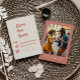Este casamento retrógrado moderno Salve o cartão de data contém texto de terracota em um fundo branco. Adicione os nomes e as iniciais do monograma da noiva e do noivo à tipografia de exibição do na moda retro e os detalhes na fonte sans serif. No verso, substitua a imagem de exemplo por sua própria foto favorita e adicione um texto breve com nomes, data e URL do site de casamento, se desejar.