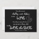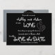 Foto romântica de amor Salve a data | Chalkboard. Elke Clarke© Cute, Cartões salve a data fotográficos divertidos com cores pretas, brancas e cinzas, a palavra Amor com uma letra branca e dois corações entrelaçados na frente e sua foto de noivado no verso. Um design de cartão de data moderno que é totalmente personalizável.