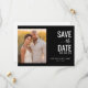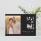 Este cartão de aviso de data de casamento apresenta um design dividido com uma foto quente e romântica de dois indivíduos contra um fundo de flores amarelas de um lado e elementos de texto elegantes em um fundo preto sólido. A paleta de cores transita de amarelos e laranjas suaves para preto profundo, criando uma atmosfera íntima. A tipografia combina fontes serifadas em negrito para "SAVE the DATE" com script cursivo para um toque pessoal adicional, enquanto o texto de espaço reservado personalizável permite uma fácil personalização. O layout geral é equilibrado e centralizado, enfatizando a clareza e a simplicidade, tornando-o perfeito para ocasiões formais.